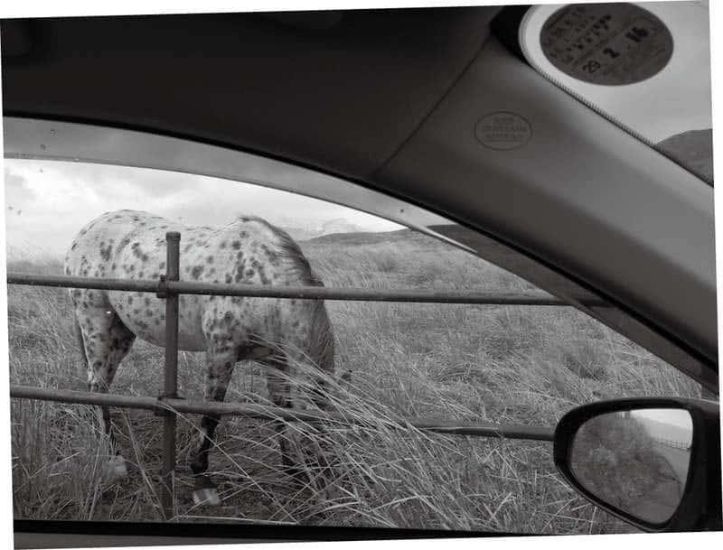 一路开,一路转,偶尔看见一群群的肥壮的牛,如常地跟寒冬对抗。再开再转,车外左方忽然有三匹马,灰的,棕的,黑的,我把车停在路边,它们竟缓慢地靠近,把头伸贴车窗,一对对可怜的眼睛望向我和大女孩,似在诉苦,不一定因为寒冷,或许只因寂寞无聊。而当我举起手机拍照,三匹马似乎不高兴了,扭颈转身,哒哒哒地跑向远方,却又于十几米处停步,木然寂然,回到了百无聊赖的孤独状态。马总是孤独的,不管有多少匹马在一起,那眼神,那步姿,永远仍然令人联想到孤独,不似牛,群来群往,是热闹的动物。